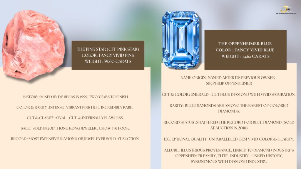 - Key Features: Named after its previous owner, Sir Philip Oppenheimer, this emerald-cut blue diamond shattered records for a blue diamond at auction in 2016. Blue diamonds are among the rarest of all colored diamonds, and the Oppenheimer Blue’s vivid saturation and exceptional clarity make it a truly unparalleled gem. Its illustrious provenance, linked to a family synonymous with the diamond industry, further adds to its allure.