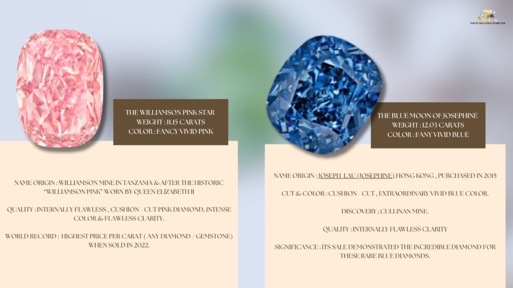 - Key Features: This cushion-cut blue diamond, discovered in the Cullinan mine, was purchased by Hong Kong billionaire Joseph Lau in 2015 and renamed after his daughter, Josephine. Its extraordinary vivid blue color and internally flawless clarity captivated the world, demonstrating the incredible demand for these rare blue treasures.